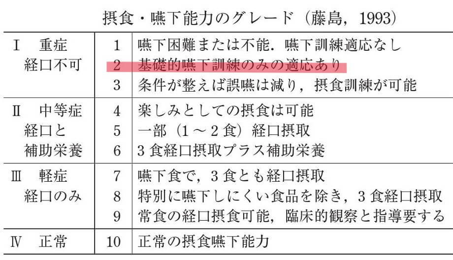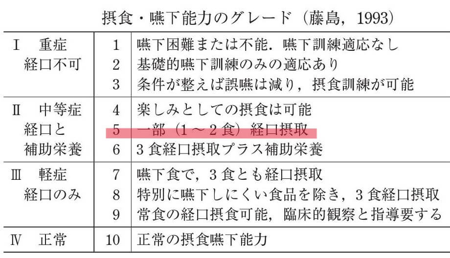 患者様は、入院時嚥下5期モデルにて準備期~咽頭期の障害があり、摂食嚥下グレードでは2に該当しており、嚥下障害を認めるため、胃瘻より濃厚流動食を注入していました。