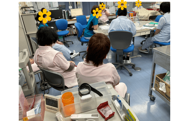 褥瘡委員会では、褥瘡予防や褥瘡へのアプローチを考える目的で褥瘡事例検討会を開催しています。病棟でのカンファレンスで、スタッフ全員が褥瘡に対する適切な対応方法、技術の共有をします。